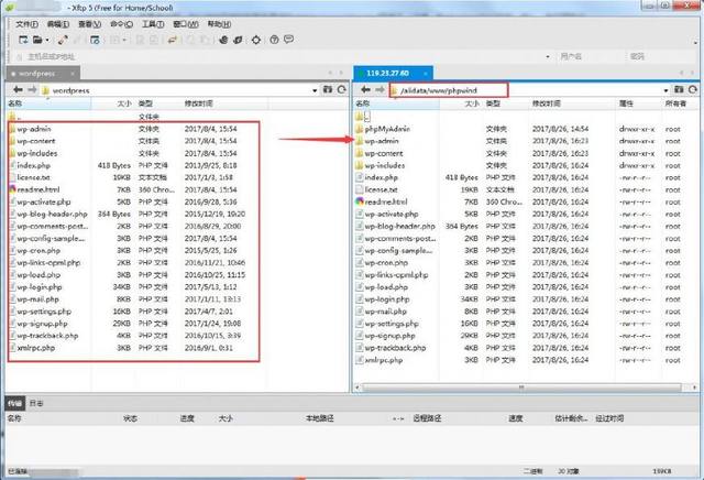 2、打开 Xshell,然后打开 Xftp,将解压缩后的文件(注意不是wordpress这个文件夹,而是里面的所有内容)上传到 Linux 服务器中的 alidata/www/phpwind 目录下(没错,和phpmyadmin放在一起)。如果找不到 alidata 文件夹,双击 名称 列的 …文件夹图标,到上一级目录即可找到。如下图: